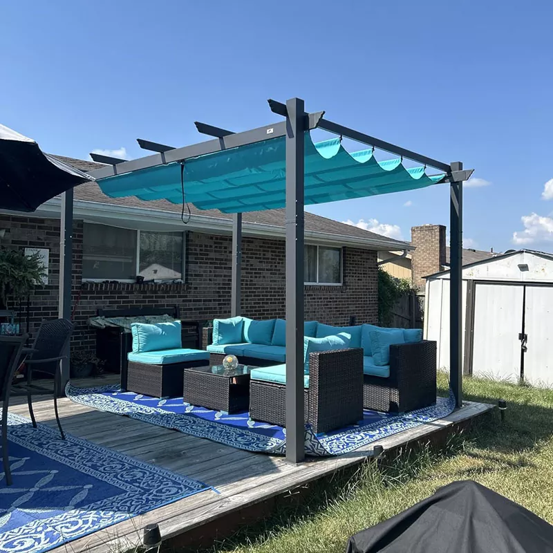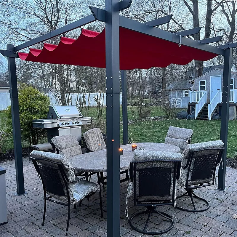 Die Aluminium-Terrassenpergola-Struktur besteht aus einem Rahmen aus hochfester Aluminiumlegierung und das Obertuch verfügt über ein Spanntuchsystem. Der Windwiderstand kann 45–65 km/h betragen (je nach Modell).